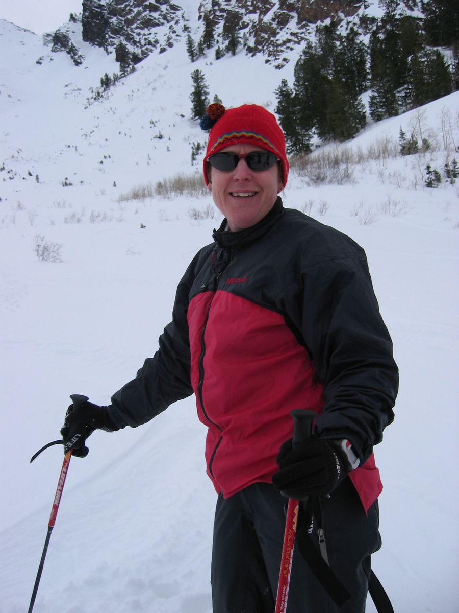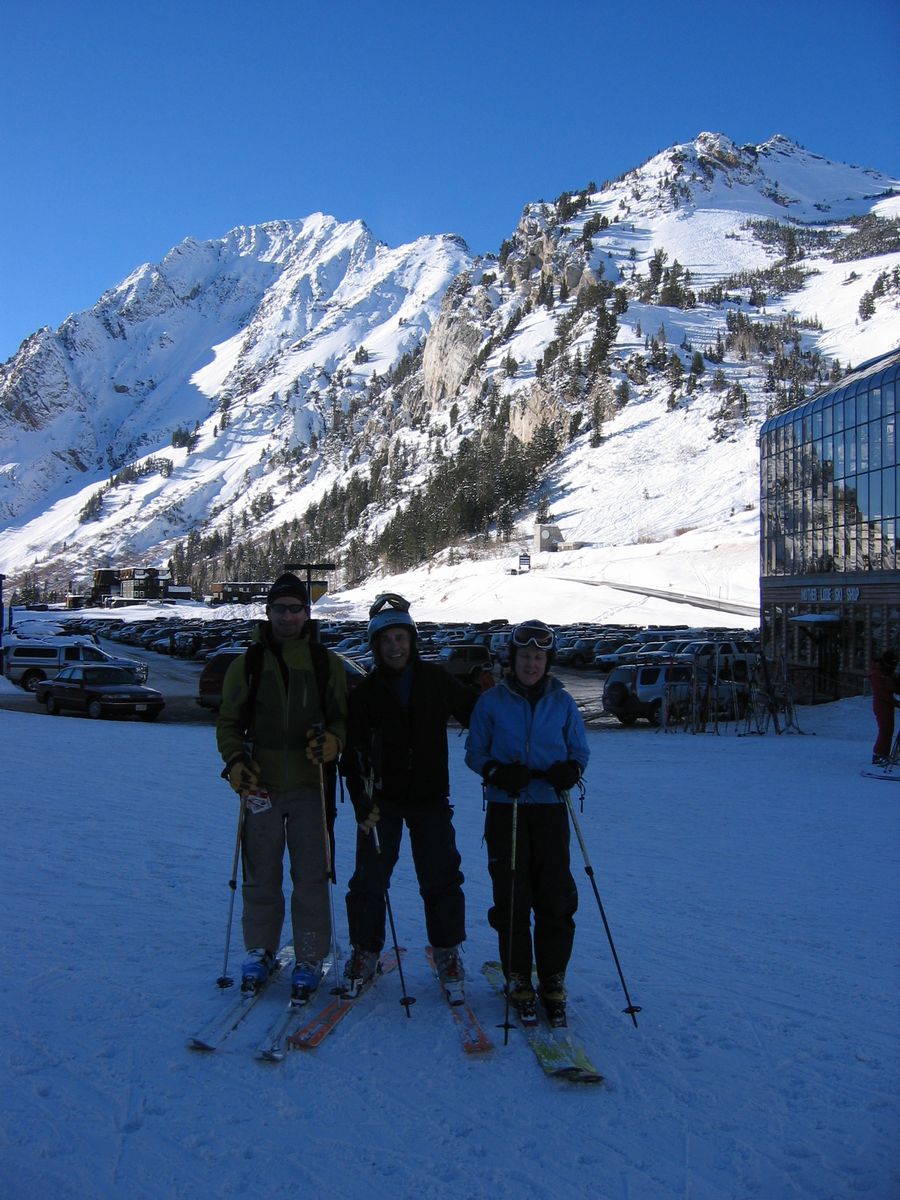 Amy and Sue backcountry, and John with thin cover at Solitude