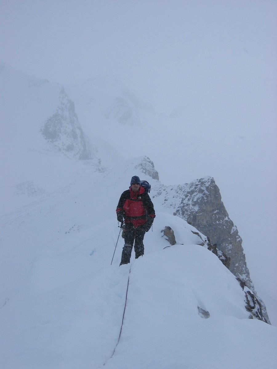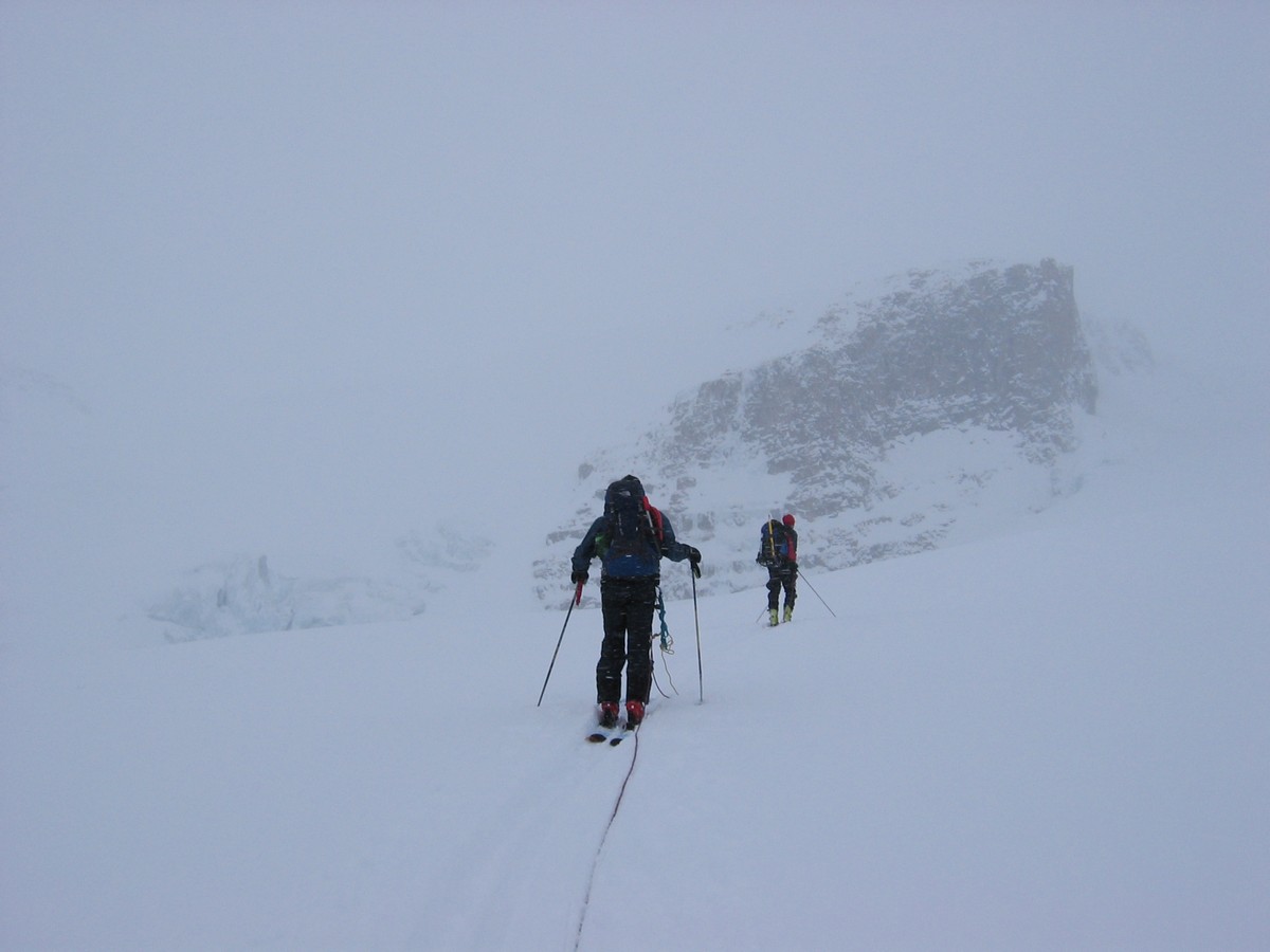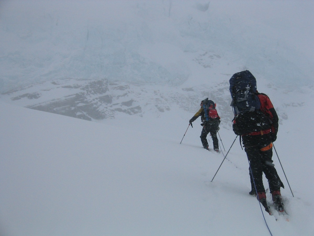 Up to the col, under and right of the nunatak, ice and seracs to our right
