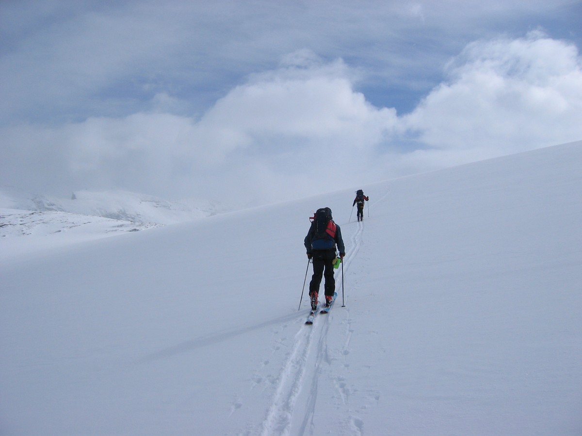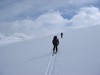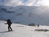 The direct route (without the ascent of Mt. Gordon) would be about 8.3km with about 1700ft up and down. The other three of our group went through the Vulture Col. This is supposed to be more avalanche prone than the route through the St. Nicholas / Mt. Olive saddle (the SE face of the col can get wind-loaded). Our group resorted to a belayed ski-cut at the top. The snow at the top was hard, but lower down was apparently good skiing.
