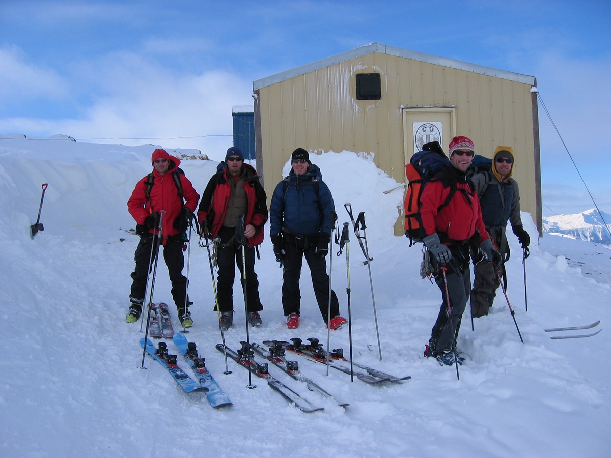 Again visibility was pretty good. We decided to climb Mt. Gordon from the south, a pretty gradual climb except for the last 20-30m. Views from Mt. Gordon were very good and the ski back down to the glacier was fun. (We ended up taking our full packs up, but we were warned about the ravens if we stashed anything at the bottom. The ravens have learned to get into packs and steal food, so we were told to bury anything we stashed during a side-trip.) Three of our group went E over the saddle between St. Nicholas and Mt. Olive onto the Vulture glacier, then south but giving the crevasses on the east flank of Mt. Olive a wide berth. (We were told that in poor visibility one can head east or ESE from the saddle until one runs into the rock walls on the east side of the glacier, then follow those south, to safely avoid the crevasses under Mt. Olive.) The ski down the glacier towards the Balfour hut was not really steep enough for fun skiing. We easily found the hut, but again my GPS reading in the field did not match the coordinates on the ACC site.
