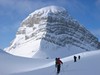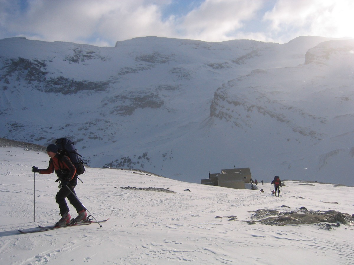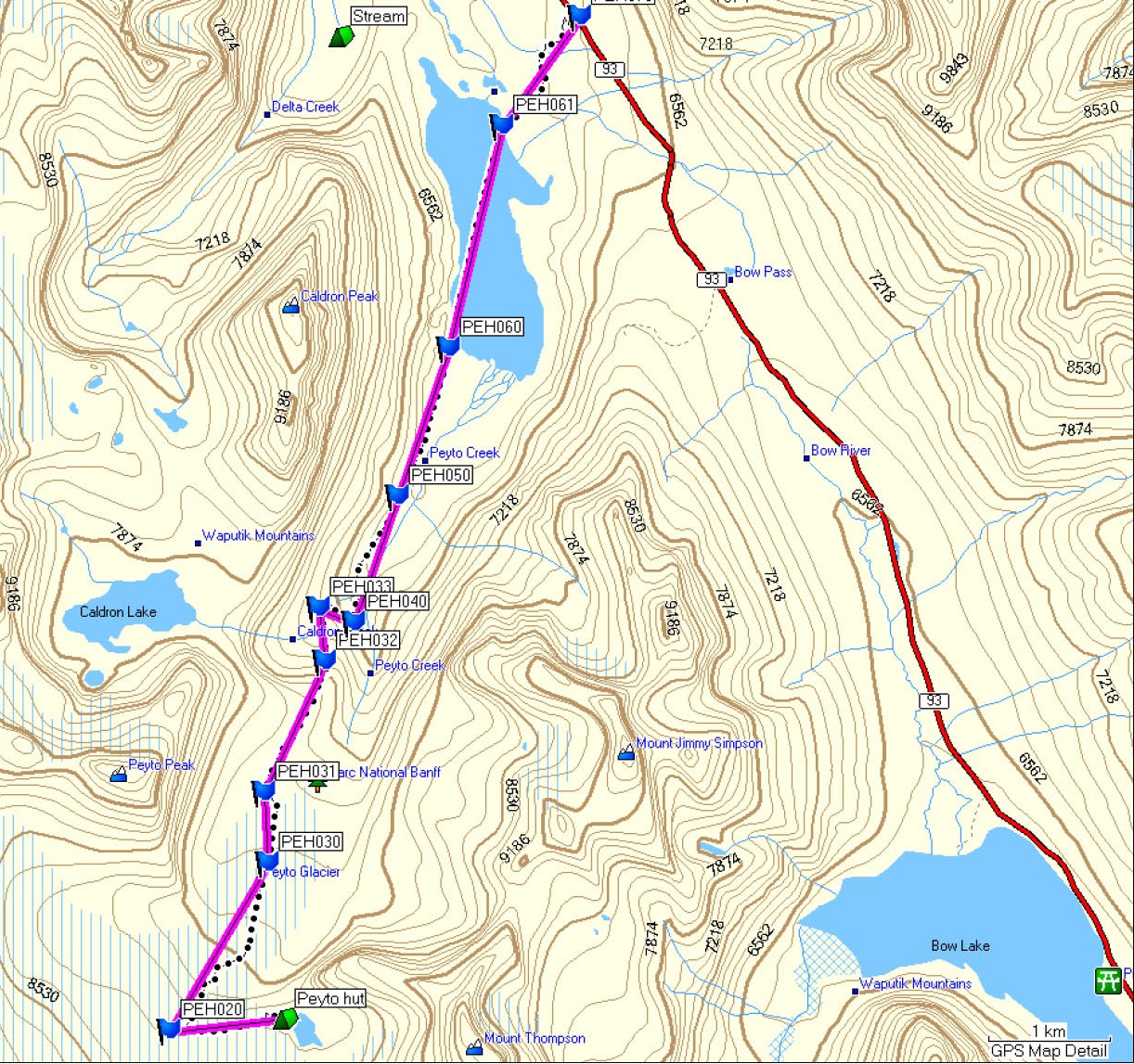 We started in the small parking pull-off about 2.5km beyond Bow Pass. The first 1km was a narrow downhill trail with somewhat slick conditions to the lake. Then across Peyto Lake and up along Peyto Creek. We took the moraine route, up to the right of the Peyto Creek gulley, because it is supposed to be less avalanche prone. (The rib up the moraine can be seen in one of the pictures left. The start up the rib to the moraine is about 4.3km from the start of the lake and about 2.5km from the end of the lake.) The climb up the rib was a little steep and wind-blown in spots and was the most technical part of the whole traverse. Then across the top of the moraine with a couple spots where we had to take off skis because of rocky outcroppings. We had a short down-hill to the glacier (avoiding an obvious crevasse) and then across the middle of the glacier until it steepened. The hut is just over the left steepest part of the glacier but we stayed in the middle or towards the right on the climb up the steep part to avoid crevasses. This meant we went up and then turned back (to the left) to access the hut with a short climb. The hut coordinates given on the ACC site dit not match what I got in the field so I substituted my reading.