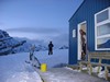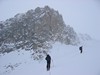 This is the route with the most objective danger, and considerable navigational difficulty in poor visibility. We started about 9:30 in moderate visibility (you can see in the photos). We had plenty of visibility for close navigation (avoiding crevasse, etc.) but not enough to see distant land-marks. We were quite happy to be using GPS with decent way-marks. We took the safer avalanche route (easterly route up the ramp under and to the west of the nunatak). The way-mark for the col was taken from an ACC accident report and proved to be right on the mark. From reading trip and accident reports the key here seems to be not straying east into a cliff area, and of course visibility (worse than we had and we might have waited a day). The col itself was wide, flat, and windy. The trek across the glacier to the Scott Duncan hut was uneventful but slow in low visibility. In the end we probably should have stayed a little more east (left) - we lost a couple hundred feet that we had to regain when we reached the hut. We missed the easy ramp up to the hut that lies NNE of the hut (just under Mt. Daly) and accessed the hut by a rocky route from below and south of the hut.