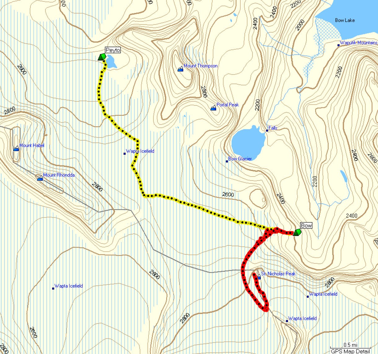 This was a pretty easy day. Visibility was OK to good. We followed other people's tracks up the glacier heading south, then turning a little SE, for about 3 1/4 km from the hut. (We probably could have headed a little further south and gained a little more altitude to then glide down towards the Bow hut.) Then we turned ESE towards the Bow hut. We were warned not to turn east too early as that would take us down towards the Bow glacier. In good visibility the key seems to be to wait to turn E until you can see the St. Nicholas peak, and then go down under that. The Peyto - Bow route was easy enough that I think we could easily have gone Peyto - Balfour hut in one day (in decent conditions, of course).
